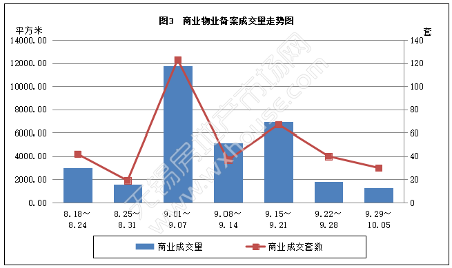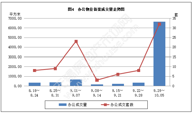 受国庆假期影响,本周楼市备案成交量下滑。本周(9.29~10.05)无锡全市商品房备案成交面积为5.31万平方米,环比减幅28.86%,其中,商品住宅备案成交面积为4.51万平方米,环比减幅37.74%。值得一提的是,本周办公物业备案成交涨幅较大,主要受恒颐荟苑成交影响,项目集中备案成交面积为0.66万平方米,31套。