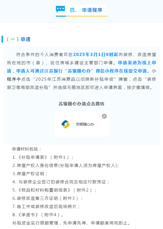 市场网首页 > 新闻中心 > 本地新闻 > 正文 2025年旧房装修补贴申领公告 2025-02-24 16:56:02 无锡住建 2025旧房装修补贴申领公告 按照《江苏省住房和城乡建设厅 江苏省发展和改革委员会 江苏省财政厅关于2025年加力扩围实施旧房装修、厨卫等局部改造以旧换新工作的通知》相关要求,现将2025年无锡市旧房装修、厨卫等局部改造物品材料补贴申领有关事项公告如下: (责任编辑:张一男)