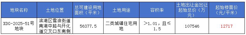 南湖中路与开化道交叉口东南侧地块(XDG-2025-51号)位于滨湖区南湖中路与开化道交叉口东南侧,占地面积56377.5㎡,二类城镇住宅用地,容积率>1.0且≤1.5,起拍总价107546万元,折合楼面单价12717元/㎡。