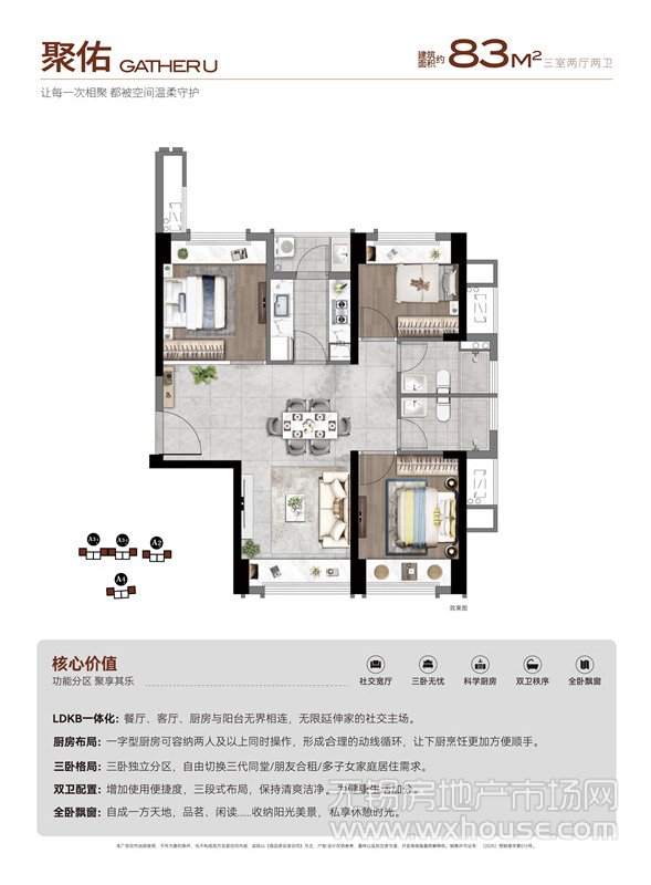 3室2厅2卫 建筑面积约:83.0㎡聚佑户型